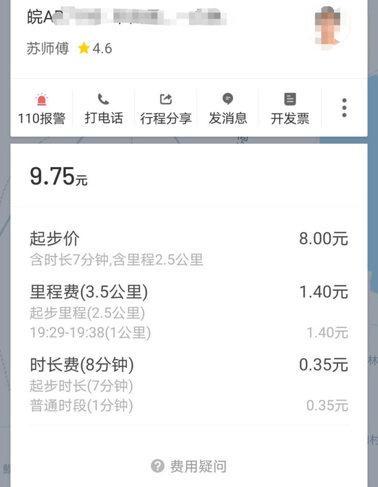 晚上7点高峰时段,记者在合肥又乘坐了一辆网约车,行程3.5公里。在车上,记者跟司机苏师傅聊起平台抽成话题,苏师傅表示自己不清楚平台抽成比例,也不太关心这个话题:“反正要抽钱,你叫它少抽也不可能。”记者到达目的地后,与苏师傅比对账单,记者支付9.75元,苏师傅实际收到7.31元,抽成比例为25.02%。