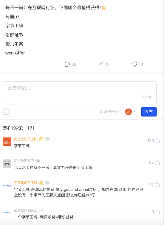 比如询问字节工牌和诺贝尔奖哪个含金量高的——