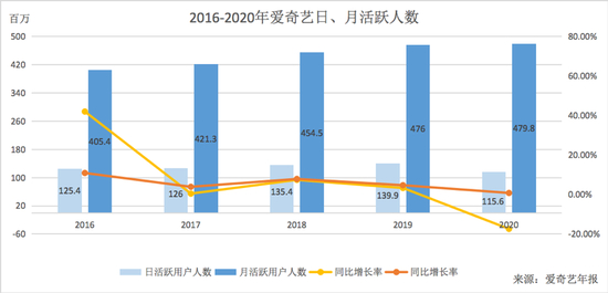 2016-2020年,爱奇艺的日活跃用户数量分别为1.25亿、1.26亿、1.35亿、1.4亿、1.16亿,分别同比增长42.02%、0.48%、7.46%、3.32%、-17.37%。