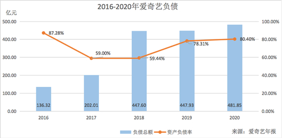 2016-2020年,爱奇艺负债总额分别为18亿元、119亿元、266亿元、350亿元、387亿元,同期,资产负债率分别为87.28%、59.00%、59.44%、78.31%、80.40%。