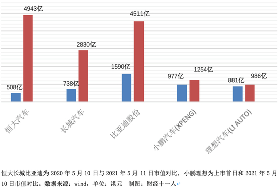 相比一年前,恒大汽车市值增加了近9倍,涨幅远高于比亚迪股份(1211.HK)、长城汽车(2333.HK)、小鹏汽车(NYSE:XPEV)、理想汽车(NASDAQ:LI)。