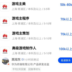 近日,多家媒体报道,华为在脉脉上发布了一组有关游戏研发的招聘信息,其中涵盖了游戏制作人、主策划、主美等六个职位,地点为上海青浦区,月薪从5万+到10万+不等,普遍要求有5年及以上游戏工作经验,部分岗位要求熟练使用Unity3D或UE4引擎,有MMO工作经验的制作人优先。不过,该招聘现已被删除。