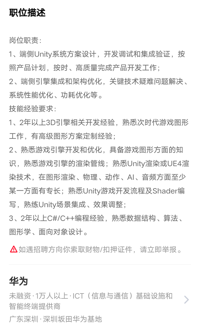 游戏行业垂直媒体GameLook指出,华为同时还在脉脉上招聘河图U3D开发工程师,在官网中招聘CG首席科学家,二者的职位描述和技能要求中都提到了游戏引擎开发能力。