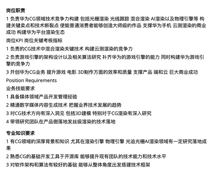 华为在CG首席科学家招聘信息中要求,“开创华为CG业务,提升游戏、电影、3D制作方面的效率和质量”,“使普通消费者能创造大师级的作品,支撑华为手机、云测渲染的商业成功,构建华为平台渲染生态。”