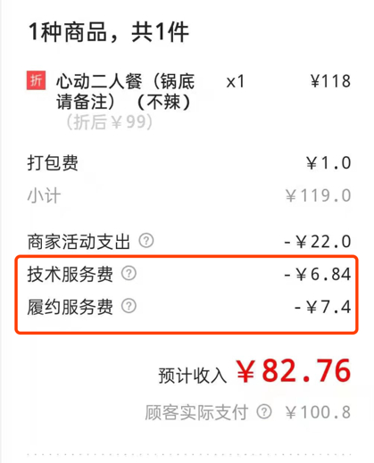 其中,技术服务费的构成,主要包括商家信息展示服务、交易服务、商服及客服服务、IT运维等服务费用,按固定比例收取,费率是5.8%。