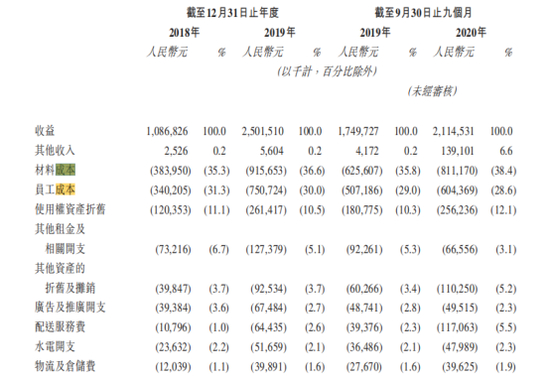 招股书显示,奈雪的茶成本构成主要是原料、员工成本和租金,2018年、2019年与2020年前三季度,公司的材料成本占比分别为35.3%、36.6%、38.4%,同期员工成本占比分别为31.3%、30.0%、28.6%,租金开支及物业管理费成本占比分别为17.8%、15.6%、15.2%。除了租金和员工都比星巴克贵,原料成本也远远贵于咖啡。