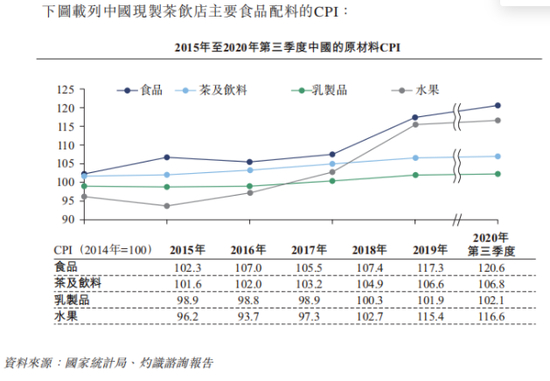 以原材料成本为例,作为现制茶饮店的主要原材料之一,茶及饮料的价格由2015年的101.6上升至2020年第三季度的106.8。另一种主要原材料,乳制品的价格于2015年至2020年第三季度保持相对稳定,但也在上升。此外,主要由现制茶饮店使用的水果的价格于2016年上半年有所下降,此后出现回升。