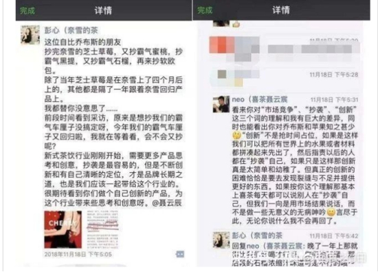 2018年11月18日,奈雪的茶创始人彭心在朋友圈发了这样一段话,并@了喜茶创始人聂云宸,直指“喜茶抄袭”。