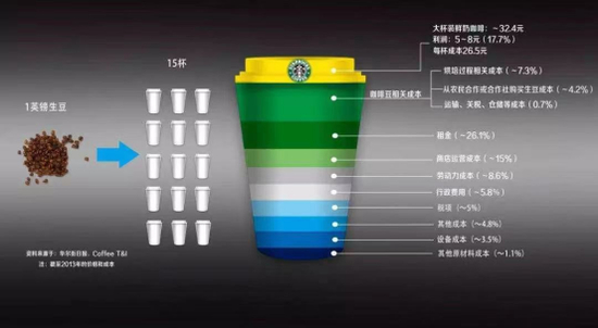 上图数据是《华尔街日报》披露的渣打银行统计的一杯星巴克咖啡的成本结构图,不难发现,原材料成本在一杯咖啡的成本构成中占比非常低,占据成本构成前两位的是租金成本和门店运营成本,分别高达26.1%和15%,而利润则为17.7%。