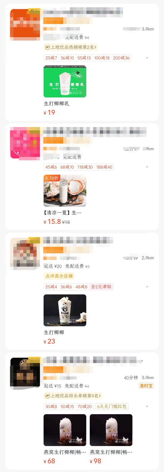 即便如今,盒饭财经随手打开美团,搜“生打椰椰”,至少有6家不同的茶饮品牌在售同名的产品。