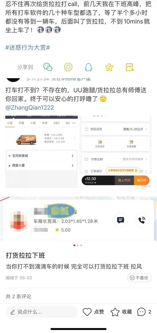 此外,并非只有北京有这种打货拉拉的现象,在微博和小红书上,上海、南京、成都、重庆等多个城市均有网友晒出货拉拉打车经历,微博还有热门问答,滴滴打不到车用货拉拉。