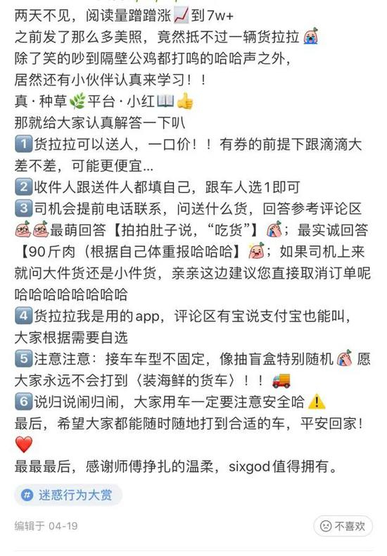 货拉拉打车并不新鲜。从今年一月至今,在小红书上不断有相关打车攻略的更新。网友“养猫人”分享经历:“豪气的叫了一个货拉拉,备注一百多斤肉。司机到了问‘肉呢?’网友拍拍胸脯说‘这呢,不劳烦您,我自己上去’。”