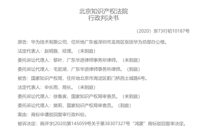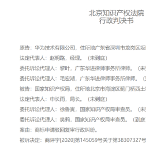 2020年8月,华为将国家知识产权局告上法庭,要求北京知识产权法院撤销国家知识产权局下达的“驳回申请决定书”,并通过华为的相关商标申请。