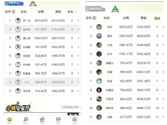 在粉丝集资最常用的软件“桃叭”上,可以看到粉丝应援会的打榜数据。以《青春有你3》为例,虽然在“倒奶“事件后,粉丝已经停止打投了,但是依然可以计算出,前9名的选手集资金额已经高达6531.89万元,榜单第一位的罗一舟已累计获得1875.85万的集资。而在另一档同类节目《创造营2021》中,前11名的集资金额高达1.31亿。