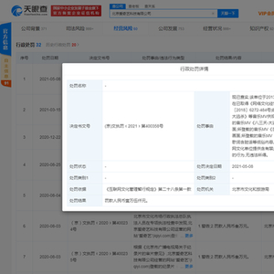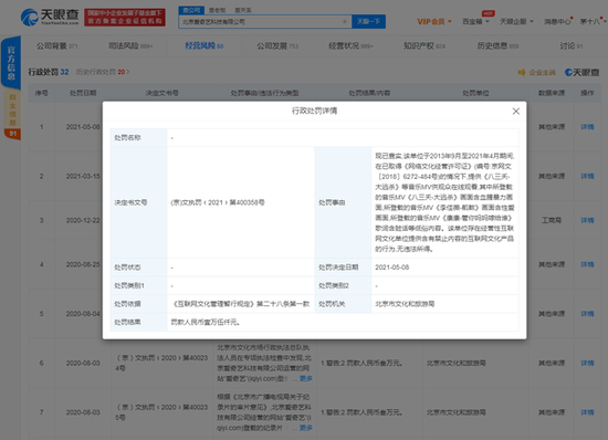 5月14日上午消息,天眼查App显示,近日,北京爱奇艺科技有限公司新增一条行政处罚,处罚单位为北京市文化和旅游局,决定文书号:(京)文执罚﹝2021﹞第400358号,处罚事由为该单位所登载的音乐MV含血腥暴力、性爱画面,歌词含脏话等低俗内容,处罚结果为罚款1.5万元。