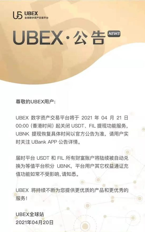 就在良心哥4月13日再次深度揭露优贝迪骗局之后的一周,优贝迪的交易所ubex发了一份公告:从4月21日起关闭usdt和fil的提币,而且要把这两个币种兑换成等值的ubnk。