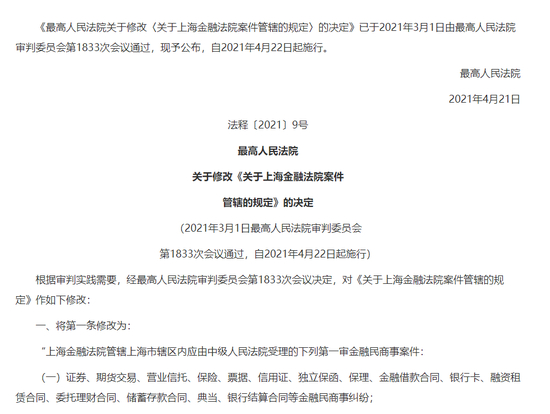 最高人民法院对上海金融法院相关规定修改,