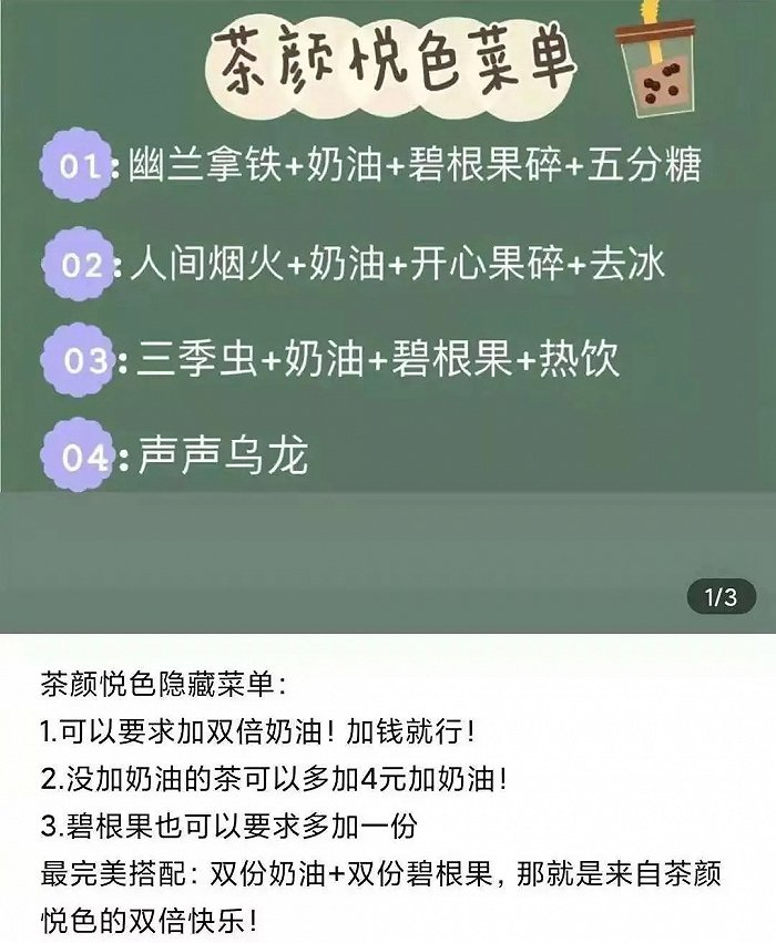 公司的产品也别具一格,设计成了“鲜茶+奶+奶油+坚果碎”的组合。虽然“鲜茶+奶”不变,但“奶油+坚果碎”被网友们玩出了很多隐藏菜单。