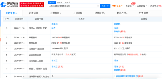 天眼查数据显示,茶芝兰是上海味湘餐饮管理有限公司旗下的品牌,公司成立于2016年,注册资本200万元,法定代表人为汪涛,经营范围为食品经营,目前未显示有外部投资。