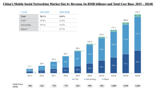 据艾瑞咨询报告,就用户数量而言,中国在2020年成为全球最大的移动社交网络市场,用户数量为8.901亿,预计到2024年将增长到10.603亿用户。中国的移动社交网络市场规模在2020年已达到人民币1162亿元,预计从2020年到2024年将以18.9%的复合年增长率增长,到2024年将达到人民币2322亿元。
