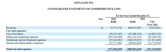 从Soul递交的招股文件中可以看出,Soul在近两年收入呈爆发性增长。截至2019年12月31日止,Soul的总收入约为7070.75万元(人民币,下同),然而2020年度Soul的总收入却飙升至4.98亿元,同比大幅增长604.33%。