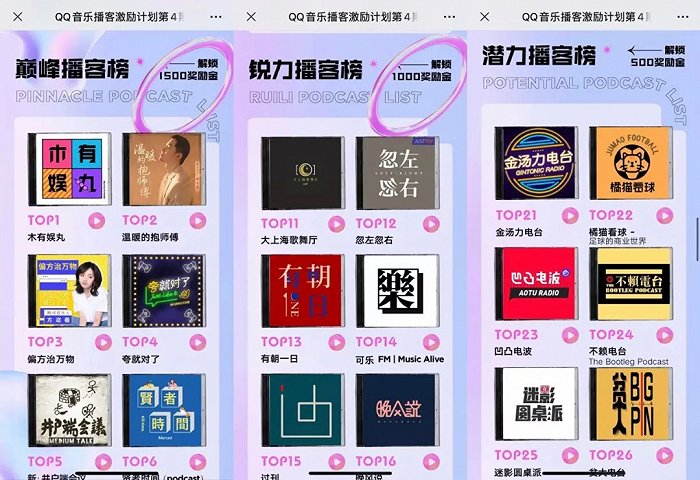 现阶段,仅有QQ音乐推出的“播客双周榜”, 每两周以“巅峰播客榜”、“锐力播客榜”、“潜力播客榜”各评选出10档播客,分别给予1500、1000、50元现金激励。同时,荔枝的“回声计划”含有一部分流量分成激励。