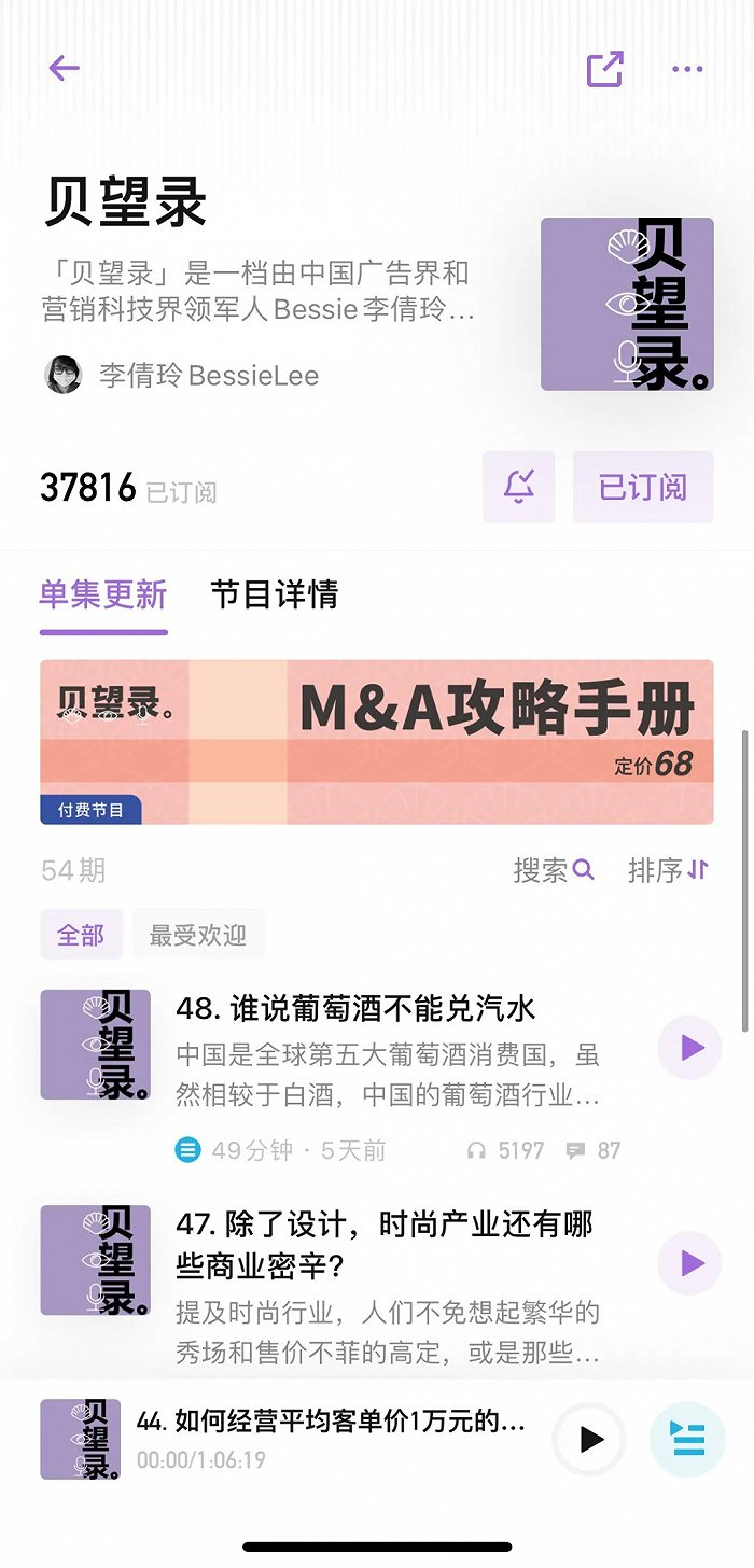 《贝望录》主理人李倩玲在营销、广告领域有超过30年的经验,她也是碚曦投资协作体创始人兼首席执行官。她能明显感受到,目前品牌广告投放的主导者大多是为品牌提供服务的代理商,通常使用传统媒介采买的方式。但如果只是一大波活动中的配角,他们通常一一拒绝。“跟节目调性不符合,帮不到品牌,听友体验也不好。”
