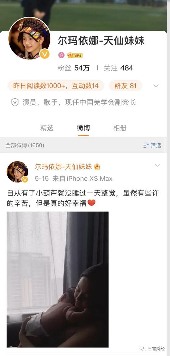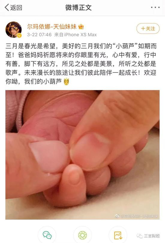今年3月22日,尔玛依娜在微博上“官宣”生子,她上传了一张孩子小手的照片,并且宣布孩子“小葫芦”诞生,文中充满对孩子的爱意。