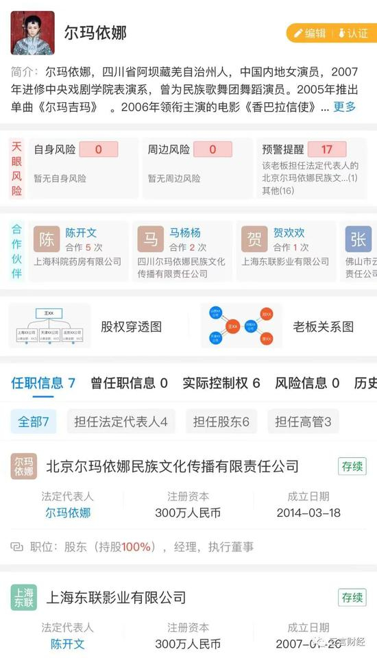 据天眼查显示,目前尔玛依娜在北京尔玛依娜民族文化传播有限责任公司、四川尔玛依娜民族文化传播有限责任公司、北京上藏羌生物科技有限公司等7家文化、生物科技、制药等公司担任股东、法定代表人以及高管。