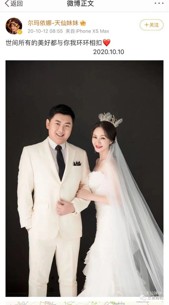 尔玛依娜个人微博中于2020年10月12日曾发布了自己的婚纱照,并且配文称“世间所有的美好都与你我环环相扣,2020.10.10”。