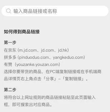 另一方面,如果不想使用商店小助手,用户只需要把平台(京东、有赞和拼多多)上的商品链接复制或分享到商品橱窗里,就可以找到对应商品进行带货。