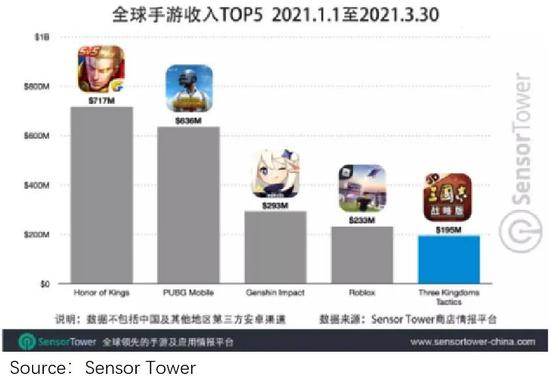 据Sensor Tower商店情报数据,2021Q1《三国志·战略版》全球收入预计超1.94亿美元,全球收入排名第5位。