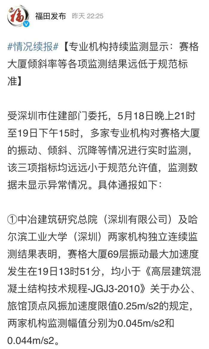 5月19日22时25分,“福田发布”的官方微博发布了最新的情况通报,称受深圳市住建部门委托,5月18日21时至19日15时,多家专业机构对赛格大厦的振动、倾斜、沉降等情况进行实时监测,该三项指标均远远小于规范允许值,监测数据未显示异常情况。