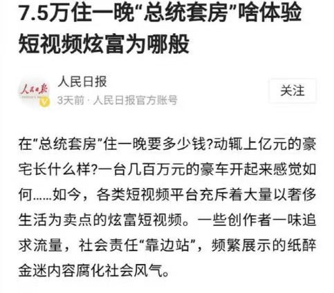 但同时,《人民日报》又发文,批判了某些充斥奢侈品的平台,频繁展示纸醉金迷的内容,对社会风气产生了负面影响。