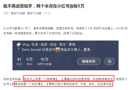 有个在知乎上主要输出穿搭的种草博主“雪梨不加糖”,在小红书上转型成了一个知识型博主,主要内容是分享自己的读书和成长。