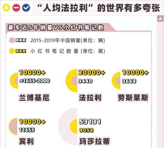 根据统计,2015-2019年间,法拉利的中国销量是3440辆,在小红书上却有超过20000+篇笔记。