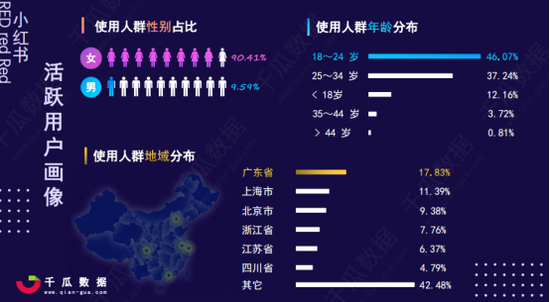而在所有女性用户中,18-24岁的妹子占46.07%,几乎是小红书女性用户的一半。另外还有37.24%在25-34岁的年龄段内。