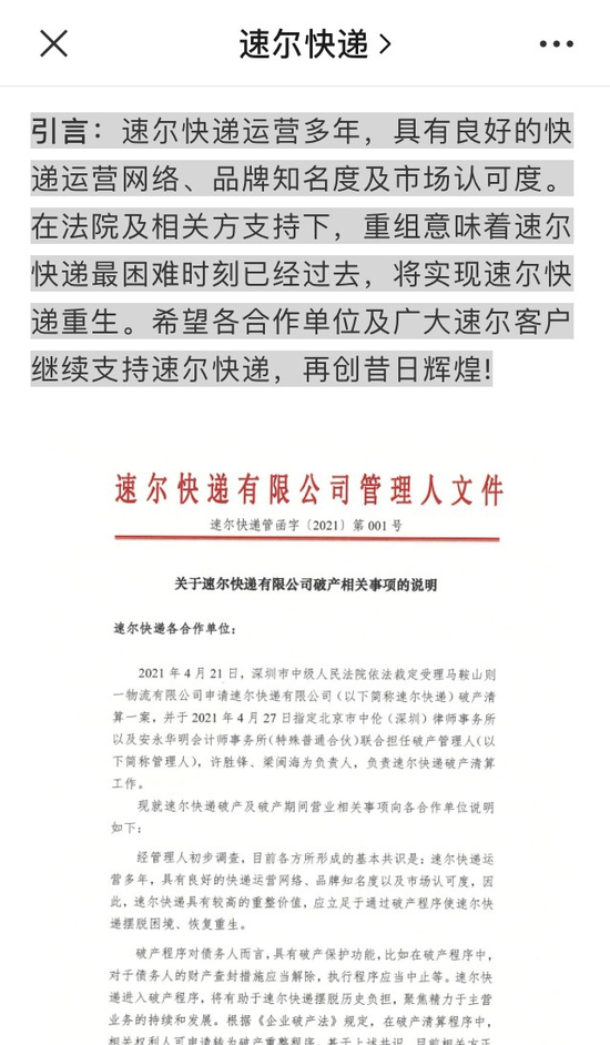 速尔快递在最新声明中称,运营多年,速尔具有良好的快递运营网络、品牌知名度以及市场认可度。重组后将聚焦主营业务的持续和发展。
