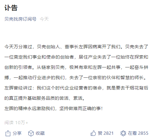 今天万分难过,贝壳创始人、董事长左晖因病离开了我们。贝壳失去了一位奠定我们事业和使命的创始者,居住产业失去了一位始终在探索和创新的引领者。从链家到贝壳,极其有幸和左晖一起共事,一起奋斗拼搏,一起推动行业进步的我们,失去了一位亲密的伙伴和智慧的师长。左晖曾经讲过:我们这个时代企业经营者的宿命,就是要去干烟花背后的真正提升基础服务品质的苦活、累活。