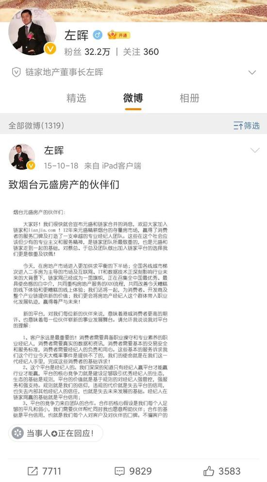 左晖的最后一条微博仍停留在2015年10月的某天,当时他兴奋地宣布了一则链家与其他平台合并的消息。现在这条微博下面,刷满了表示悼念的留言——当然也有若干“不和谐”的声音。这是一个中介老兵,通过微博留给外界的最后印记。