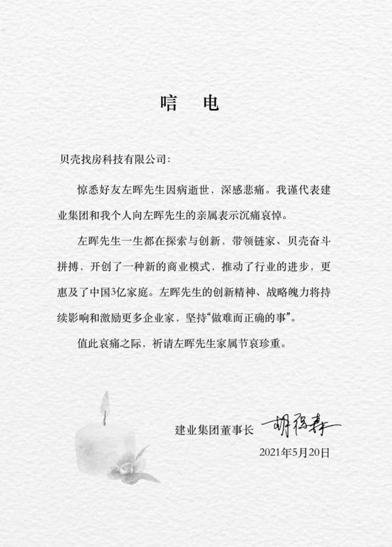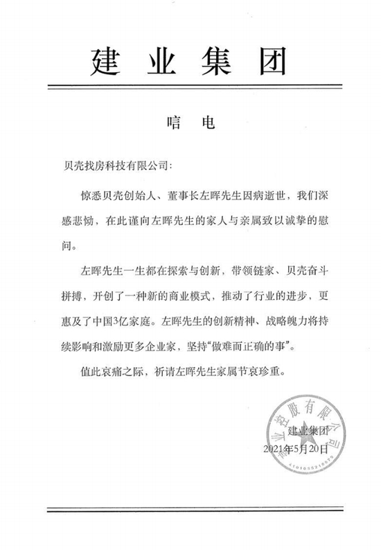 乐居财经讯 王怡5月20晚,建业集团及胡葆森个人向贝壳找房科技有限公司发出唁电。