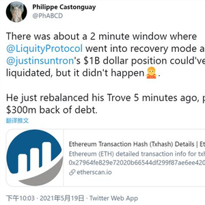 据推特账号Philippe Castonguay爆料,借贷平台LiquityProtocol 还差2分钟就将清算孙宇晨的60.6万个以太坊,这些以太坊价值10亿美元,在非常紧急的时间内,孙宇晨使用稳定币进行偿还,这些稳定币价值3亿美元,才使得这场清算没有触发。中国最大的比特币矿池创始人神鱼评价称“要是以太坊再跌100多,今晚估计就1000刀以内见”。