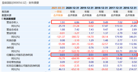 今年一季度,皇庭国际收入虽然有恢复性增长,但净利润却下滑76.79%。