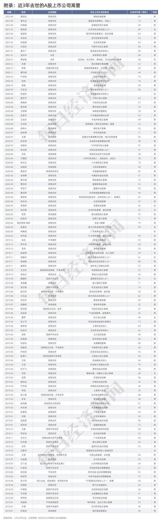 据国家卫健委发布的数据,2019年全国居民的平均预期寿命为77.3岁。而据《每日经济新闻》记者统计,2018年以来共有116名上市公司董监高或实控人等相继离世,除3名逝者未能核查到年龄外,其余去世平均年龄才59岁,比全国居民平均预期寿命少了近18岁。