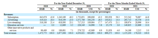 在2020年40.5亿元的营收数据中,付费订阅贡献了17亿元的收入,广告和直播业务分别贡献了10.7亿元和7.2亿元营收,广告收入的增速高达73.9%;教育服务、其他创新产品和服务营收分别为2.3亿元和2.8亿元。