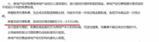 房屋租赁代理收费,无论成交的租赁期限长短,均按半月至一月成交租金额计收。房屋买卖则按成交价格总额的0.5%—2.5%计收,最高不超过成交价格的3%。