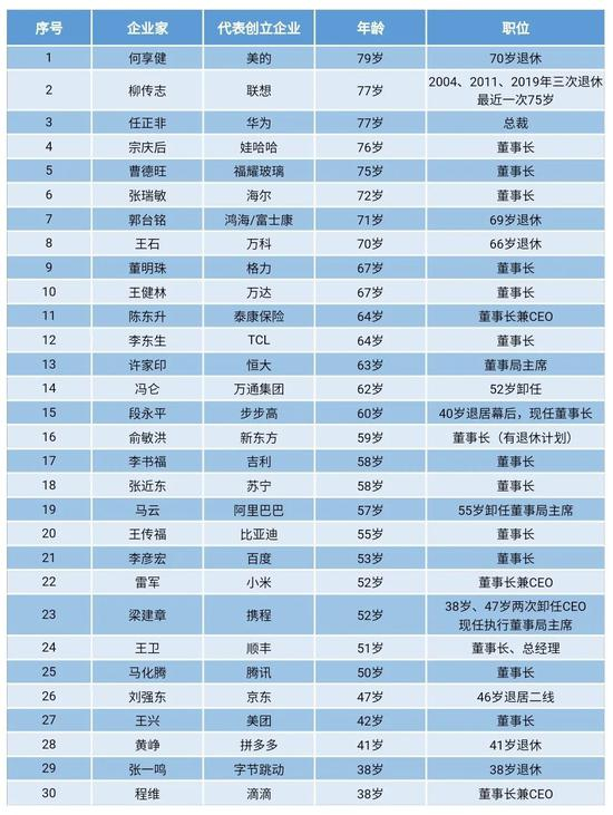 而任正非(77岁)、宗庆后(76岁)、曹德旺(75岁)、张瑞敏(72岁)、董明珠(67岁)、王健林(67岁)、陈东升(64岁)、李东生(64岁)、许家印(63岁)、俞敏洪(59岁)、李书福(58岁)、张近东(58岁)、王传福(55岁),仍在任上。其中,70岁以上有4位,60岁以上企业家有5位。