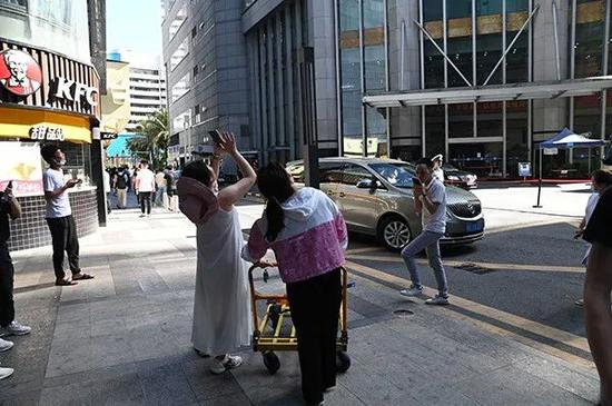 5月18日,深圳赛格大厦发生摇晃,在内办公的人员慌忙逃离。图源 | 澎湃新闻