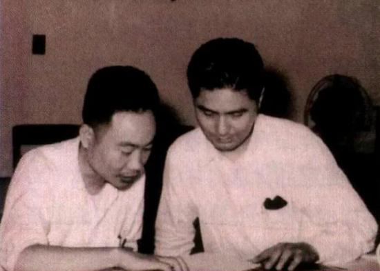 1955年,上海申新纺织公司公私合营后,荣毅仁(右)与公方代表在一起。来源:中企图库