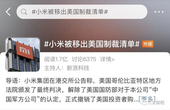 在小米发布胜诉公告后,#小米被移出美国制裁清单#的话题迅速登上热搜。